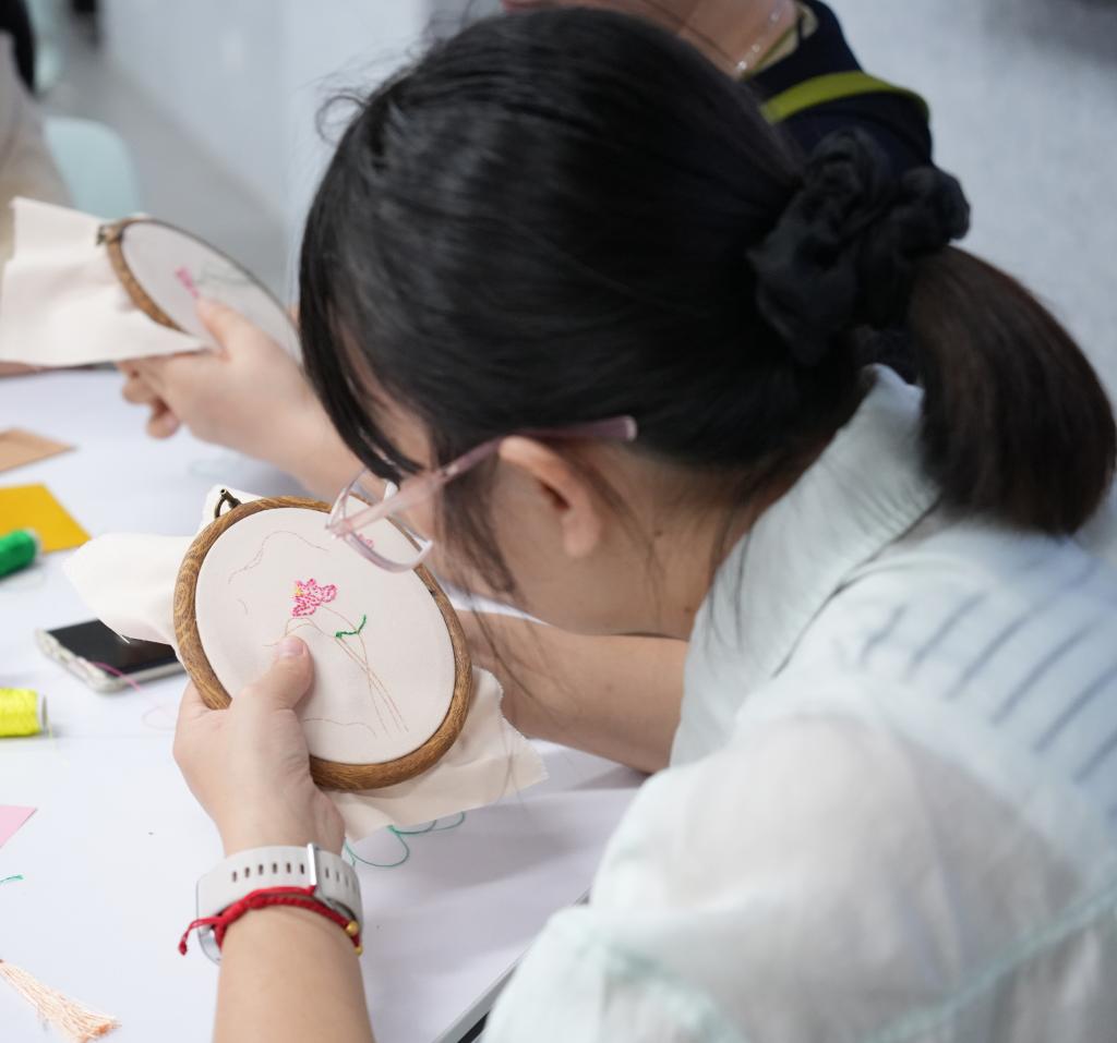 活动现场,来自学校各部门、学院的30余名老师代表,暂时放下了工作之笔、拿起了绣针,在无锡精微绣工作坊师生的指导下,全身心沉浸于“莲纹书签”的设计、选材、绣制之中;在穿针引线之间,感受着无锡精微绣的雅致品格、精巧匠心,涵养着廉洁修身、精益求精的师德风范。