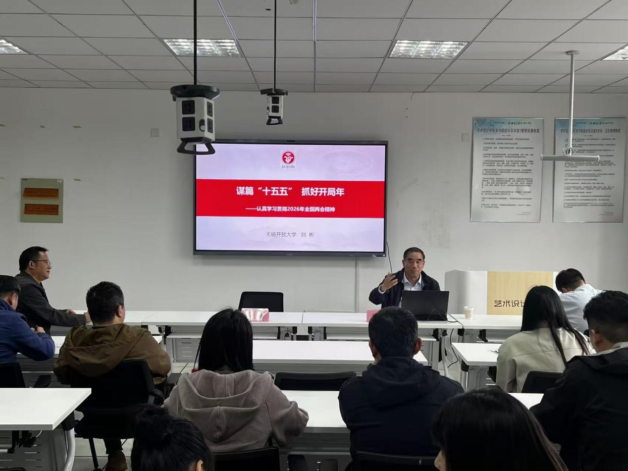 为深化树立和践行正确政绩观学习教育,促进全体教职工深刻领会国家“十五五”规划核心要义与战略部署,指引学院未来高质量发展,4月8日艺术设计学院特邀无锡市委宣讲团成员、无锡开放大学原党委书记刘彬教授来院,作题为《谋篇“十五五” 抓好开局年——认真学习贯彻2026年全国两会精神》的专题讲座。党总支书记武汉主持讲座。