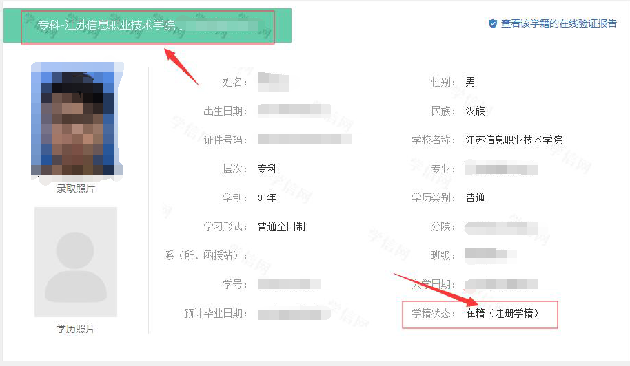 第八步:查看注册的学籍信息,确定是在籍(注册学籍)状态。个人信息各项无误,且学籍状态为“在籍(注册学籍)”,表示为新生学籍注册信息核对无误。(因为学信网平台的“专业名称”有字段长度的限制,所以可能有部分专业的“专业名称”显示不全,但这种情况不影响学生的学籍学历正常注册),新生注册专业以录取专业为准。