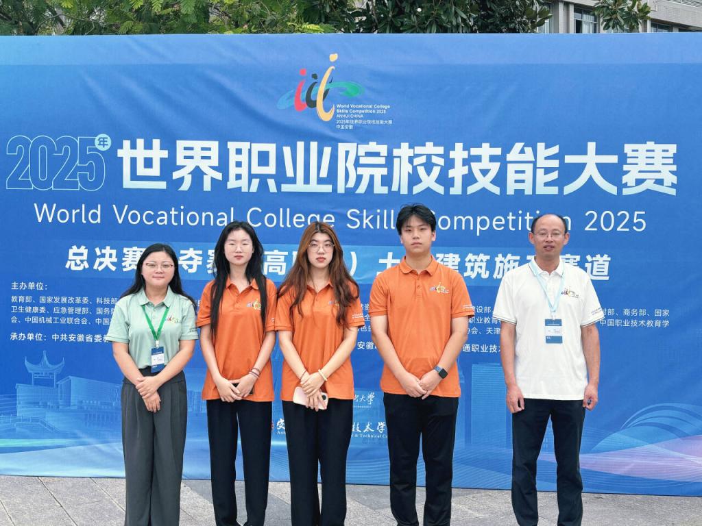 8月26日至31日,2025年世界职业院校技能大赛总决赛争夺赛土木建筑施工赛道(高职组)在安徽职业技术大学举行。我校建筑工程学院李雨晴、向荣华、张朝阳等3名同学在杨洋、张克纯老师的指导下获铜奖。