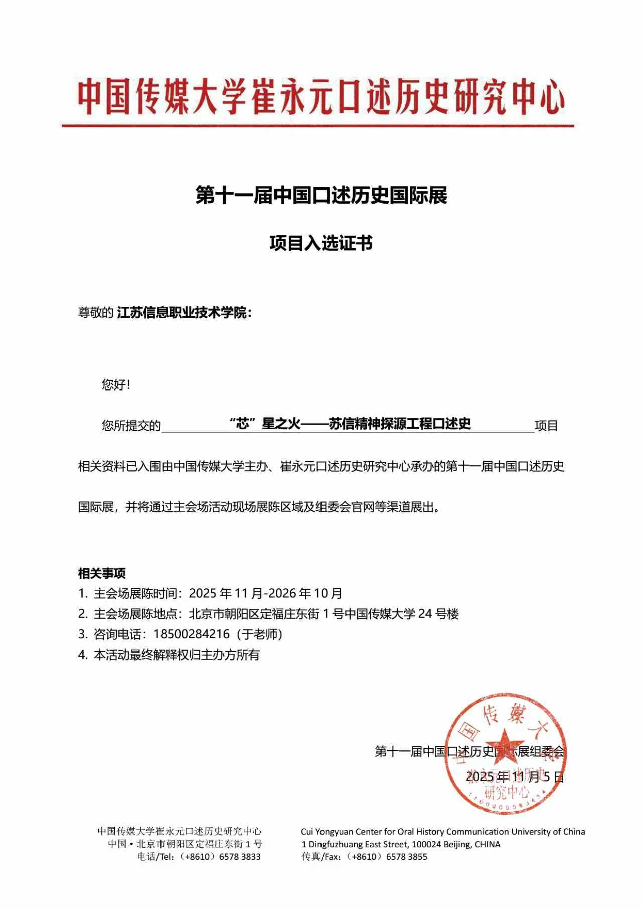 第十一届中国口述历史国际展于11月8日在北京正式揭幕。《“芯”星之火——苏信精神探源工程口述史》项目成功入选为展映作品,获得广泛关注。