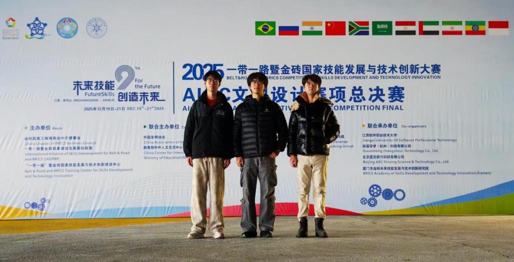 12月19日至21日,在江西软件职业技术大学举办的2025“一带一路”暨金砖国家技能发展与技术创新大赛AIGC文创设计赛项全国总决赛中,由艺术设计学院张磊老师指导的视传244班杨振鑫、视传256班曹宇航同学组成的参赛团队获一等奖,学校获评最佳组织奖。