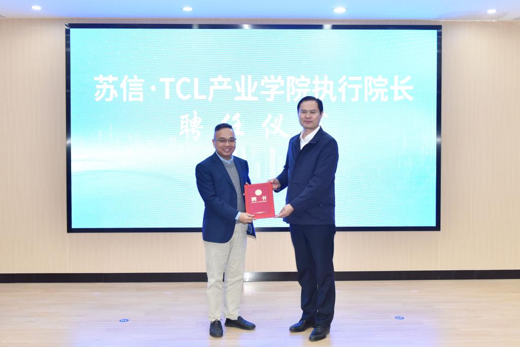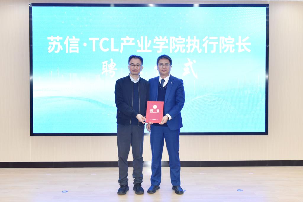 会上,左同宇书记和赵越总经理分别为苏信·TCL产业学院的校企双方首任执行院长颁发聘书,标志着产业学院进入规范化、实体化运行。苏信·TCL产业学院执行院长季云峰代表理事会,发布了产业学院理事会章程、理事会组织机构和人员名单以及产业学院建设方案。