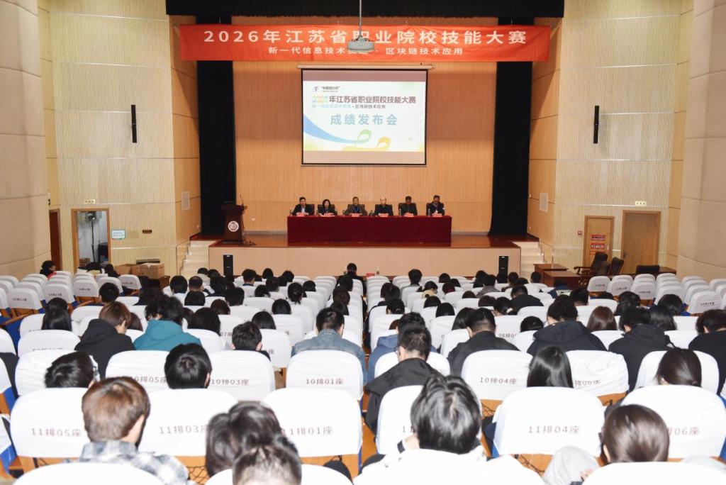 4月18日至21日,2026年江苏省职业院校技能大赛区块链技术应用赛项在我校成功举办。来自全省54支参赛队(学生组38队、教师组16队)共130名选手同场竞技。最终,由我校物联网工程学院(信息安全学院)管维红、阮文飞老师指导的曹洪波、陈旭冉、沙建国荣获学生组一等奖第一名,阮文飞老师获教师组一等奖。