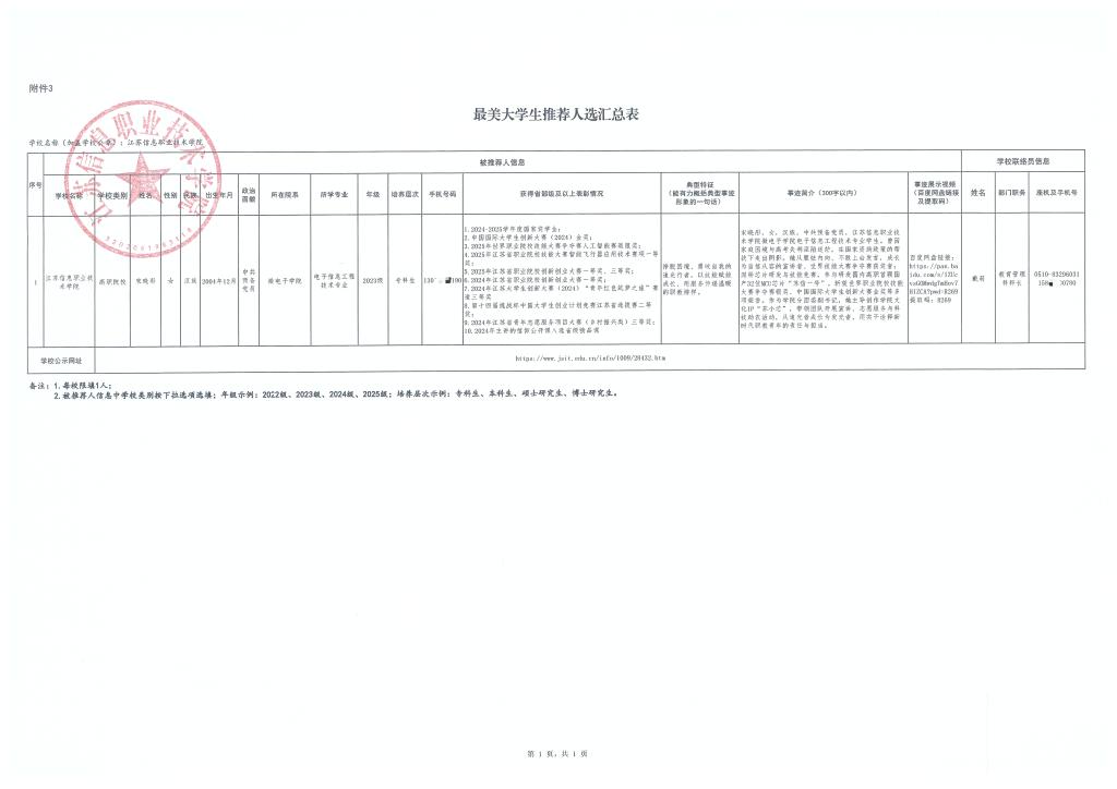 根据《教育部办公厅关于开展“最美高校辅导员”“最美大学生”推选展示活动的通知》(教思政厅函 〔2026〕2 号)、《省教育厅办公室关于转发教育部办公厅开展“最美高校辅导员”“最美大学生”推选展示活动的通知》要求,经个人申报、二级学院审核推荐、学工处组织评审遴选、学校审定,拟推荐微电子学院电子信息工程技术专业2023级宋晓彤同学作为我校2026年“最美大学生”推荐人选,现予以公示。