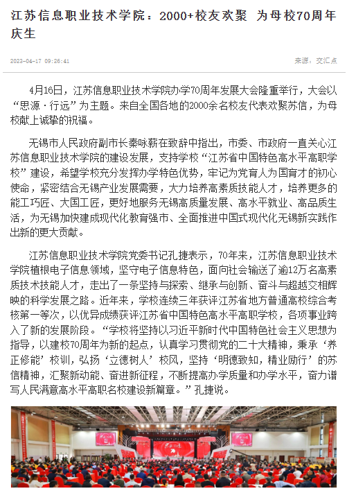 交汇点:江苏信息职业技术学院:2000+校友欢聚 为母校70周年庆生