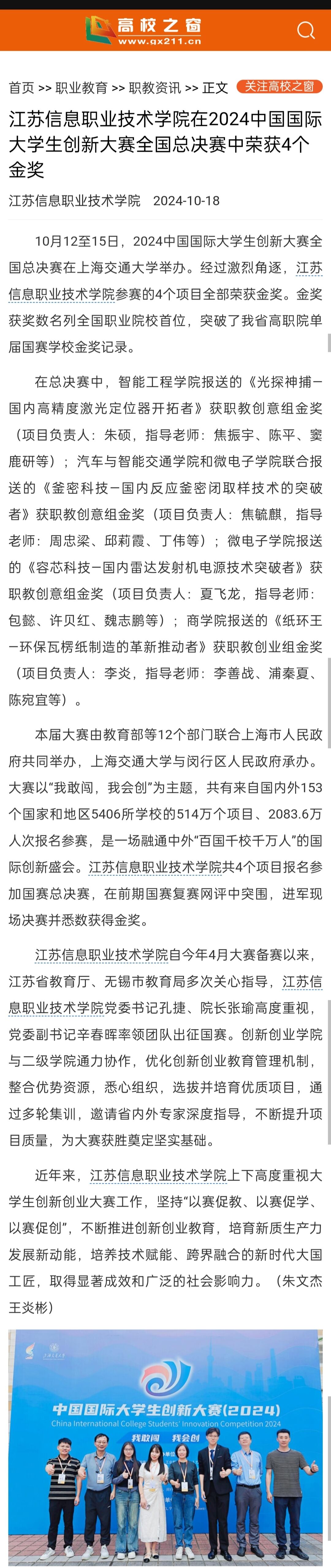 高校之窗:江苏信息职业技术学院在中国国际大学生创新大赛总决赛获4个金奖