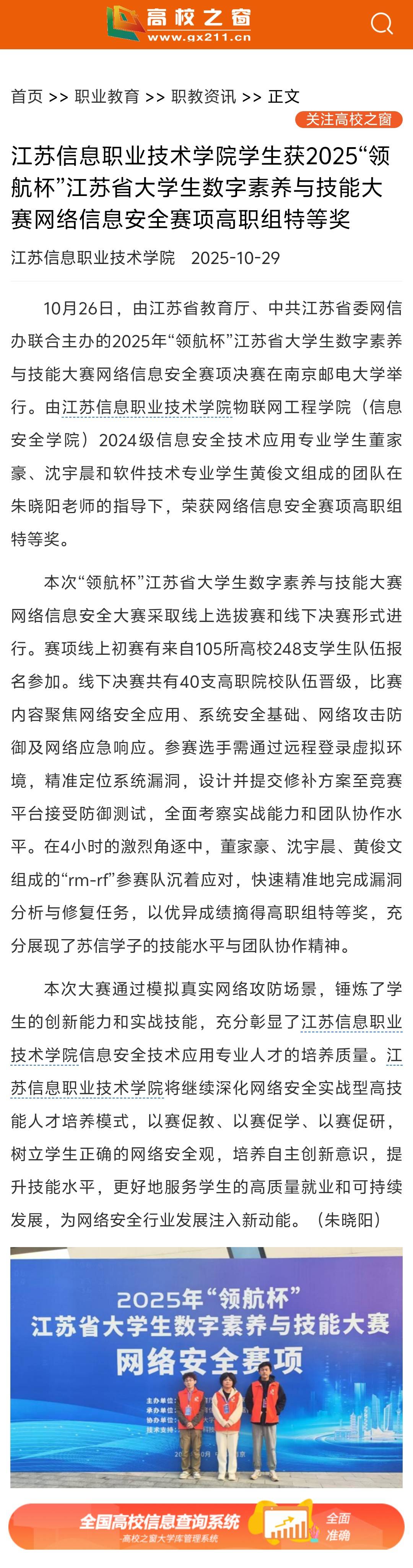 江苏信息职业技术学院学生获2025“领航杯”江苏省大学生数字素养与技能大赛网络信息安全赛项高职组特等奖