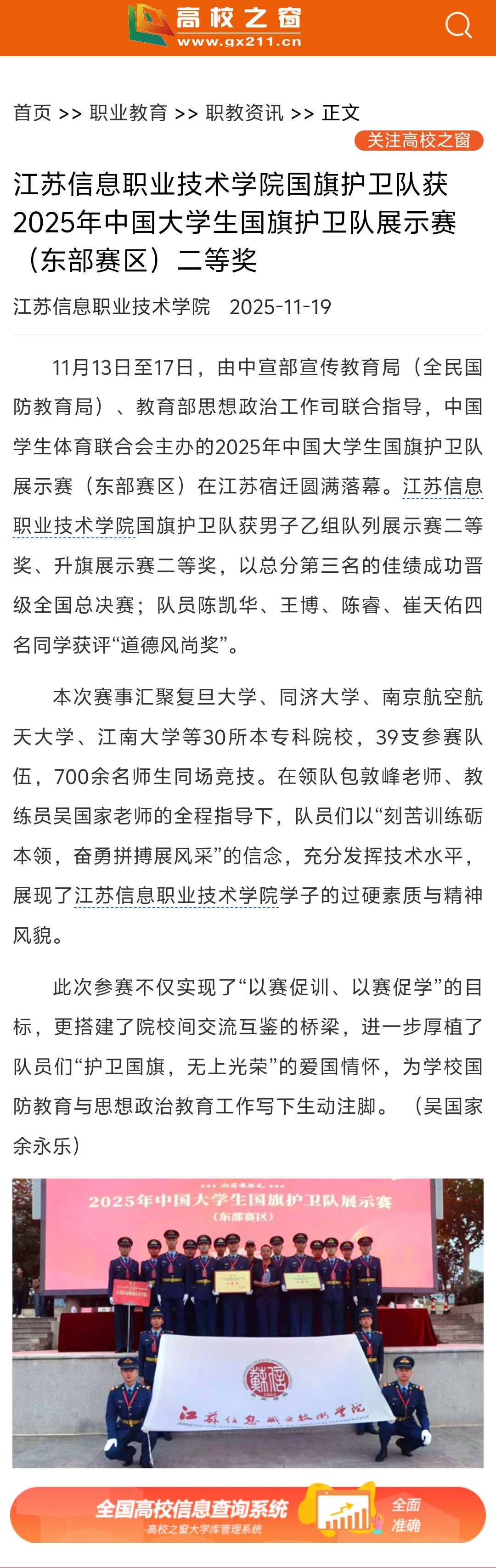 江苏信息职业技术学院国旗护卫队获2025年中国大学生国旗护卫队展示赛(东部赛区)二等奖