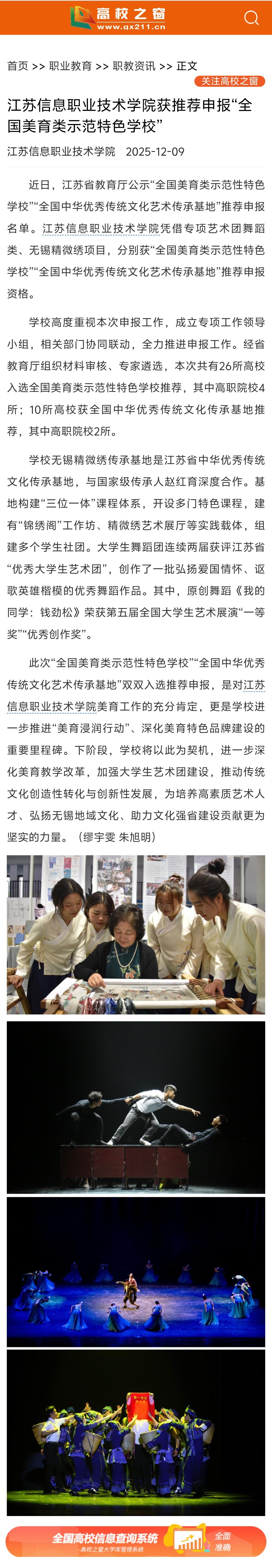 江苏信息职业技术学院获推荐申报“全国美育类示范特色学校”