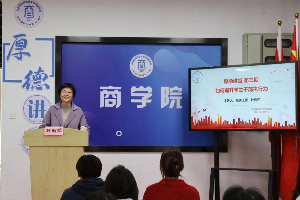 为进一步加强商学院学生干部队伍建设,提高学生干部的综合素质和工作能力,3月1日,商学院分团委邀请校关工委孙丽萍老师走进商学院“厚德讲堂”开展《如何提升学生干部执行力》专题讲座。