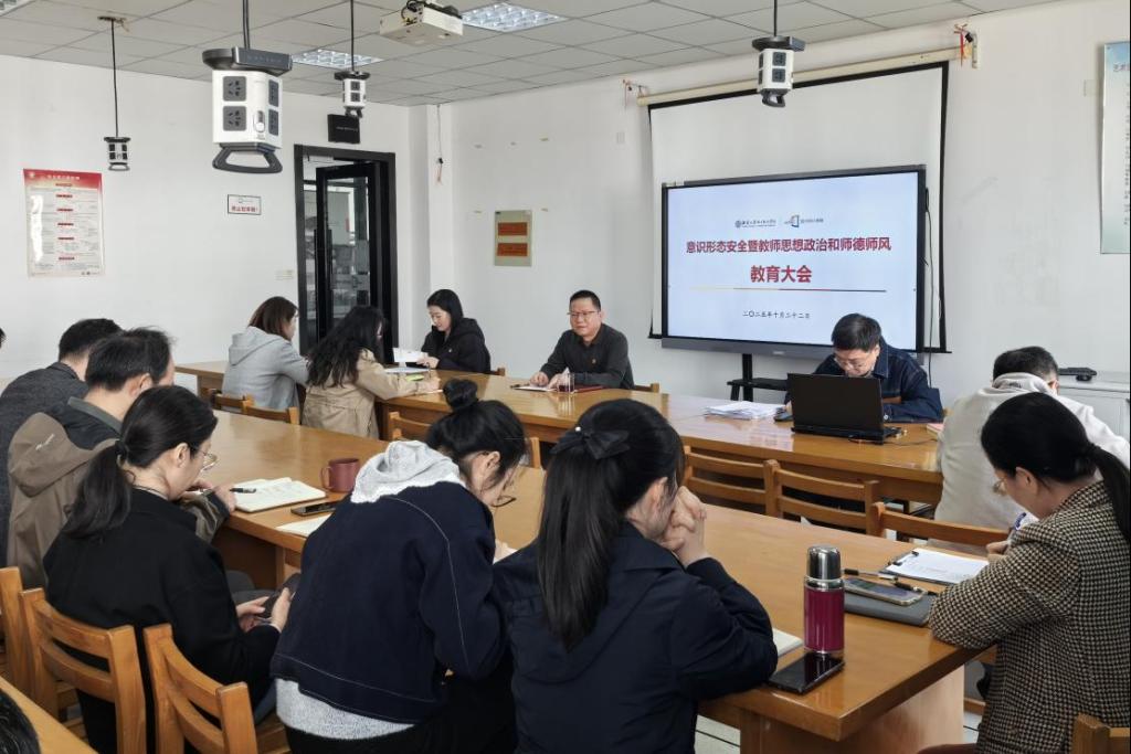 党总支书记武汉领学习近平总书记关于意识形态工作重要论述的精神,传达了学校2025年下半年意识形态暨师德师风建设工作会议要求。他结合当前国内外形势与学院实际情况,普及了意识形态的概念内涵,解读了学校《贯彻落实意识形态工作责任制实施办法》,布置了学院意识形态重点工作任务。他指出,全体教职工要提高政治站位,深刻认识意识形态工作的极端重要性;重视理论学习、感悟原理,坚持运用习近平新时代中国特色社会主义思想指导教学科研和管理服务;主动担当作为,积极落实意识形态工作责任制,结合岗位职责做好六大阵地建设;自觉对照《新时代高校教师职业行为十项准则》,积极投身于学院的教育教学改革和各项事业发展中;以警示案例为鉴、举一反三,追求师德“高线”、严守职业“底线”、远离行为“红线”,保持优良的师德师风。