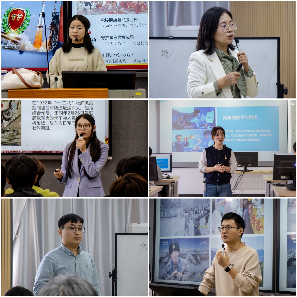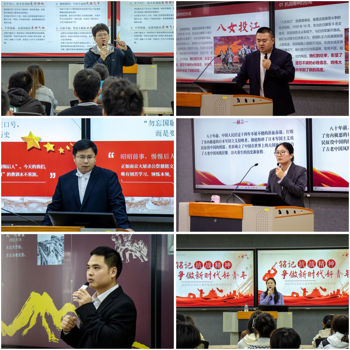 建筑工程学院李娜老师从抗战时期的“土”工程与军事工事讲起,引导同学们感悟一代代建筑人肩负的使命与担当,在历史的砖石结构中解读出传承抗战精神的时代课题。微电子学院高贤老师立足时代方位,以“弘扬抗战精神,笃行民族复兴”为核心,系统阐述了伟大精神与民族复兴的内在联系,激励青年学子将历史感悟转化为笃行实干、报效祖国的磅礴力量。物联网工程学院施小英老师巧妙融合专业特长,以“代码致敬历史”为主题,指导学生通过编程再现历史场景,在数字世界中铭记与弘扬伟大抗战精神,展现了科技与人文的深刻联结。