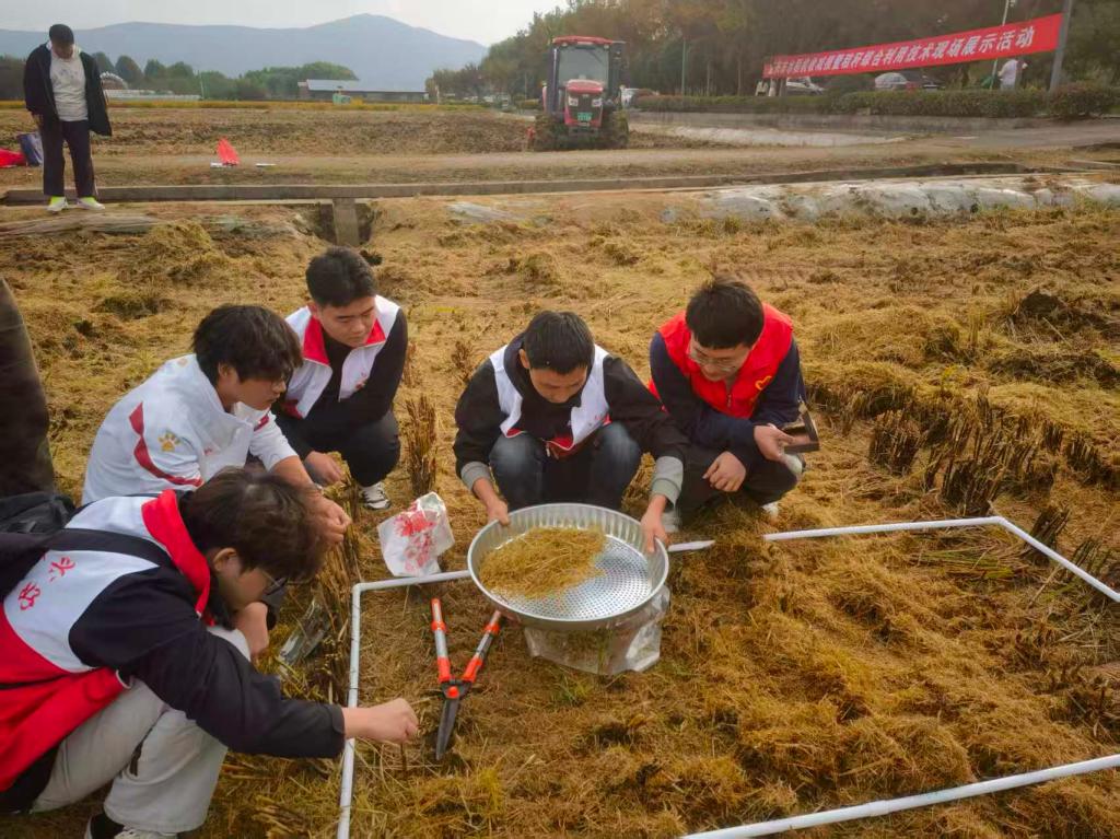 党员师生组建技术服务队,开展农机检修、技能指导等服务。活动组织开展2025年水稻机收减损大比武活动,对农机收割减损情况进行测算,用专业设备记录作业损耗率,手把手教农机手调整收割机参数,助力亩产减损增收。