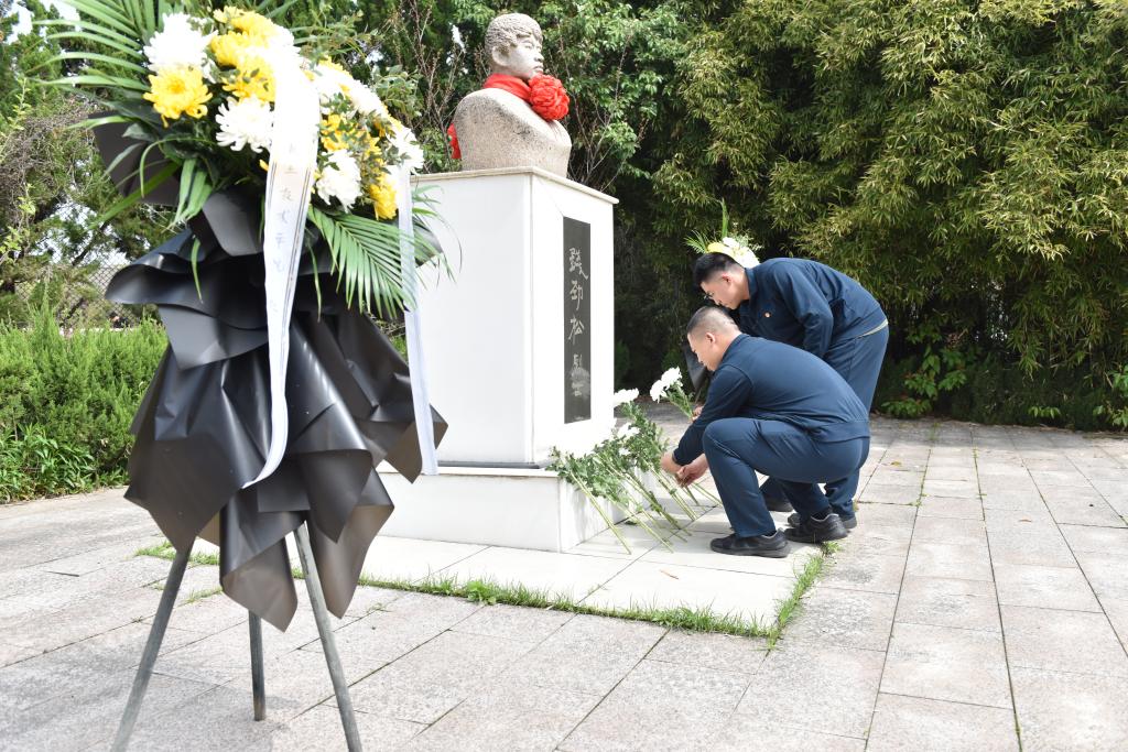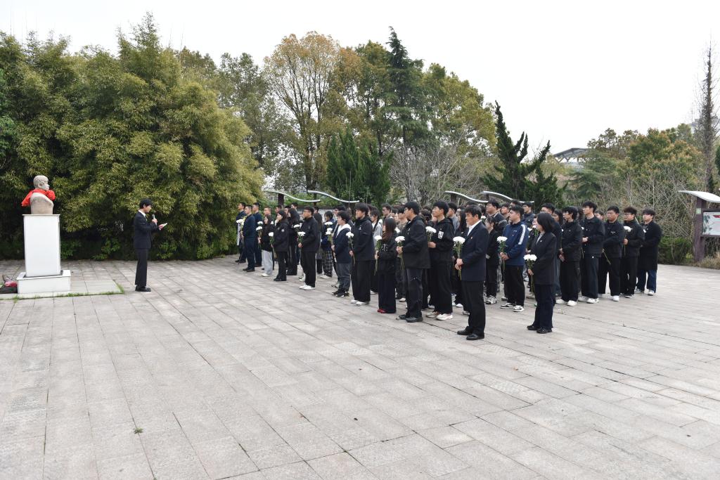 师生敬献鲜花,瞻仰烈士纪念石像。