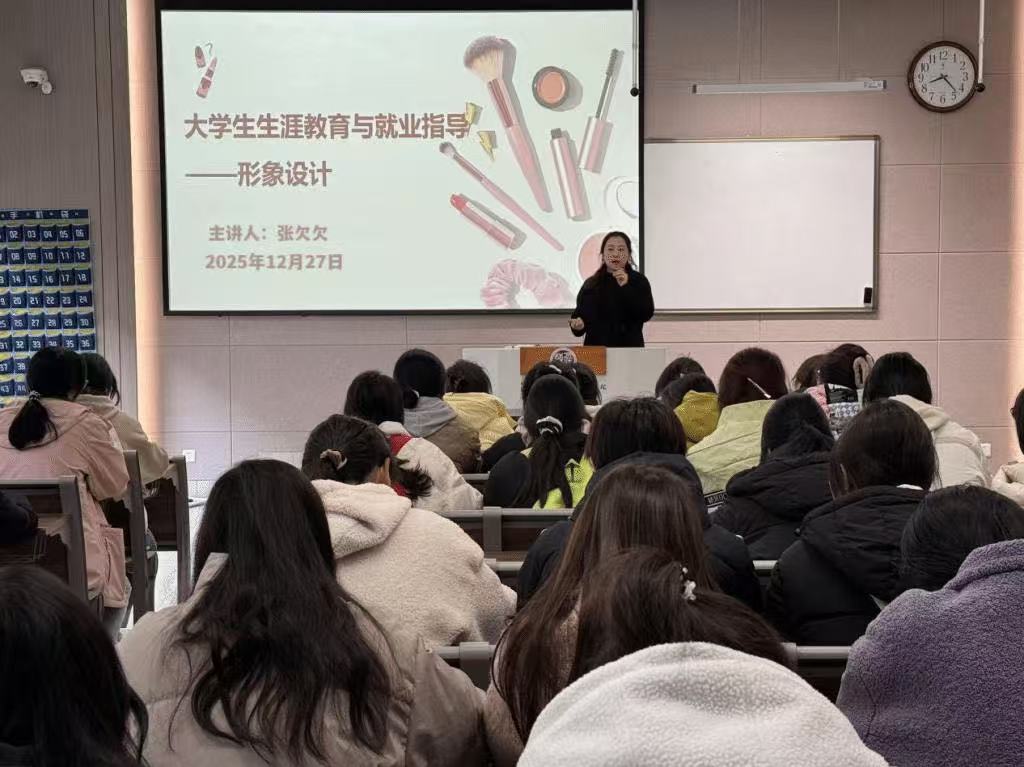 讲座中,张欠欠结合自身职业经历,强调了个人形象在求职与职场发展中的重要性,从社交礼仪、妆容设计、服装搭配等方面展开详细讲解。她不仅分享了日常交往礼仪规范、基础护肤步骤,还现场演示多款适配不同场景的职业妆容技巧,给出实用的色彩与款式搭配建议,助力同学们打造专业时尚的职场形象。讲座现场互动热烈,同学们积极交流提问,氛围浓厚。