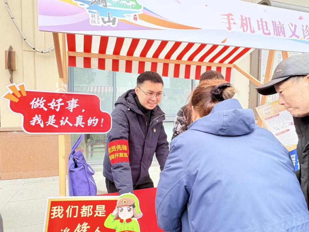 学生党支部现场开展了”数字赋能,手机义诊”、“防诈宣讲,守护‘养老钱袋’”、“活力八段锦,乐享‘健康银龄’”三个板块的志愿服务。针对老年群体面临的“用机难”问题,结合物联网工程学院专业特色,活动现场设立了“手机义诊”服务台。学生党员们一对一协助操作智能手机,解决手机卡顿、内存清理、屏蔽骚扰信息等实操问题,切实帮助居民们享受数字技术带来的便捷。党支部现场开设“防范电信网络诈骗”微课堂,精心制作了针对老年群体的防诈宣传单,对于如冒充亲友、保健品推销、虚假中奖信息等常见骗局,宣传“不听、不信、不转账”,进一步增强了老年群体的法治意识和自我防范能力。传统养生功法轩的师生们现场带领老人们练习中国传统健身功法——八段锦。通过分解动作、细心指导,现场气氛活跃,弘扬了中华传统养生文化,更引导社区居民树立了科学健身的理念。