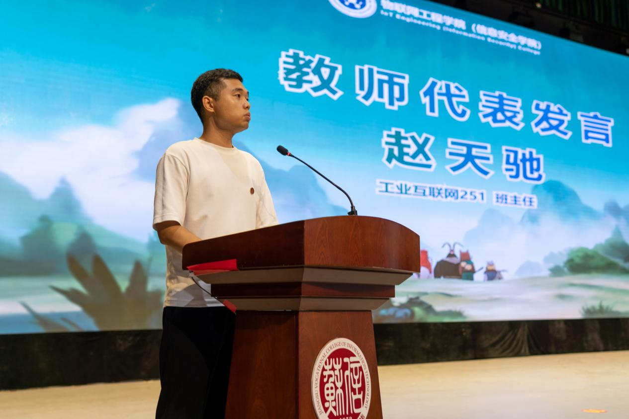 教师代表、工业互联网251班班主任赵天驰老师代表全体教师发言。赵老师从学院优势开始介绍,以“转变”为关键词,用“角色转变、学习方式转变、心态转变”三个方面,呼吁新生们以梦为马,不负韶华,在学院的舞台上尽情挥酒才华,成就属于自己的精彩人生。