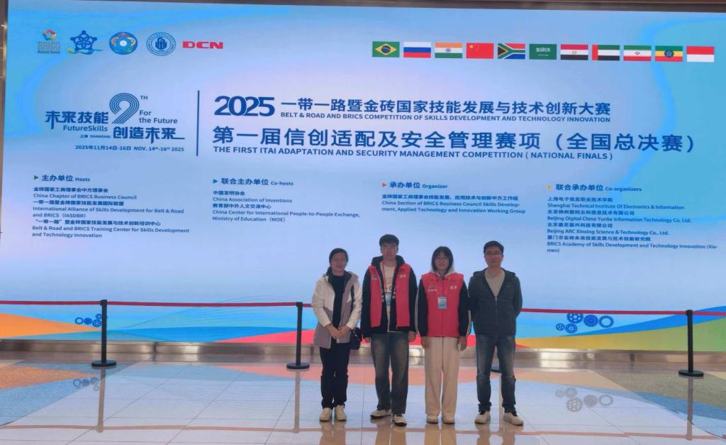 11月14日至16日,2025“一带一路”暨金砖国家技能发展与技术创新大赛第一届信创适配及安全管理赛项全国总决赛在上海电子信息职业技术学院隆重举行。本次赛事汇聚了来自全国105所院校的122支参赛队伍同台竞技,我校物联网工程学院(信息安全学院)陆红蕾、王锐老师指导的软件246班顾泽宇、董静默同学组成的参赛团队凭借扎实的专业功底和出色的综合能力,在激烈角逐中脱颖而出,成功斩获一等奖。