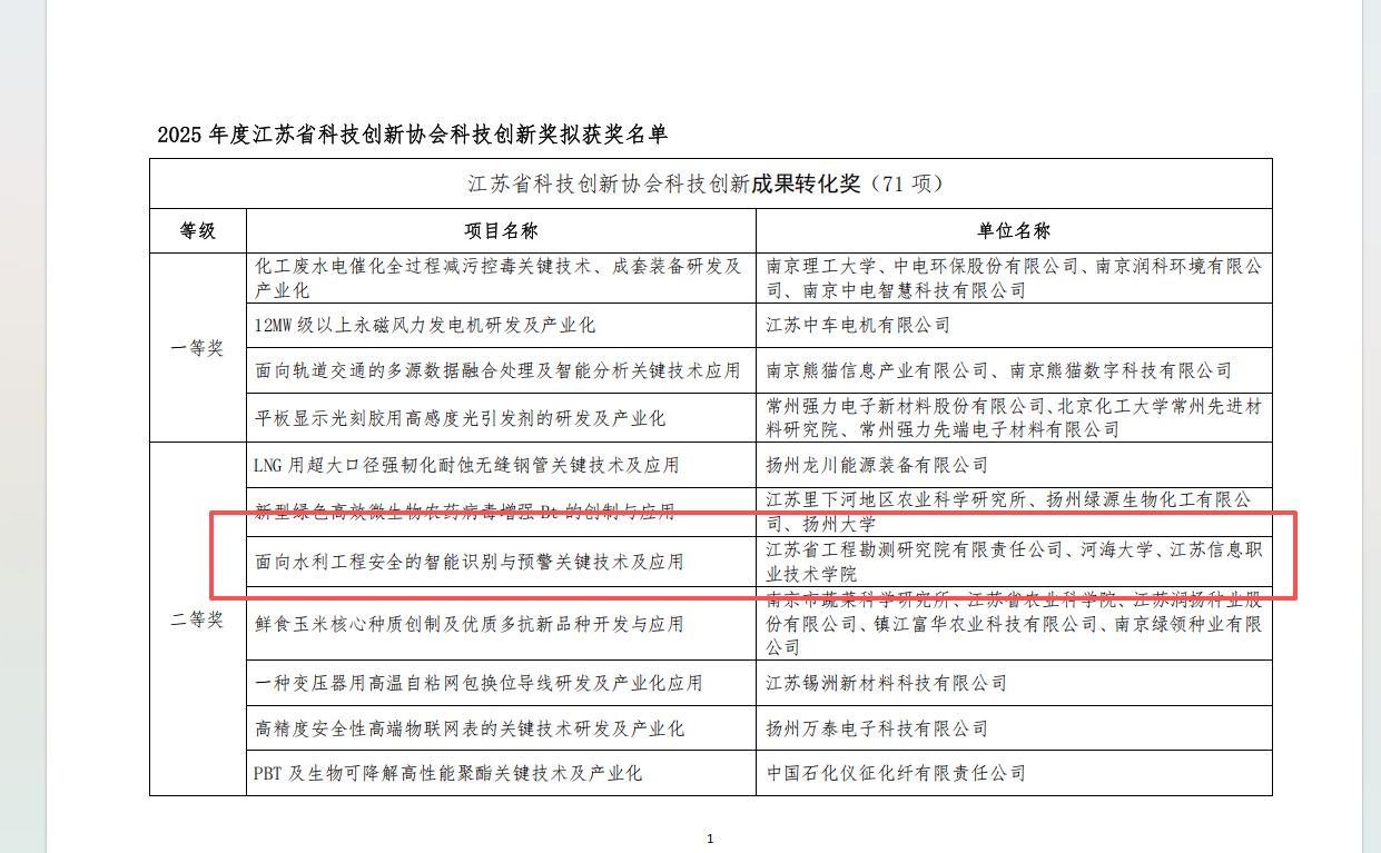 近日,2025年度江苏省科技创新协会科技创新奖评选结果正式揭晓,我校物联网工程学院黄理军博士及其团队联合企业完成的“面向水利工程安全的智能识别与预警关键技术及应用”荣获二等奖。