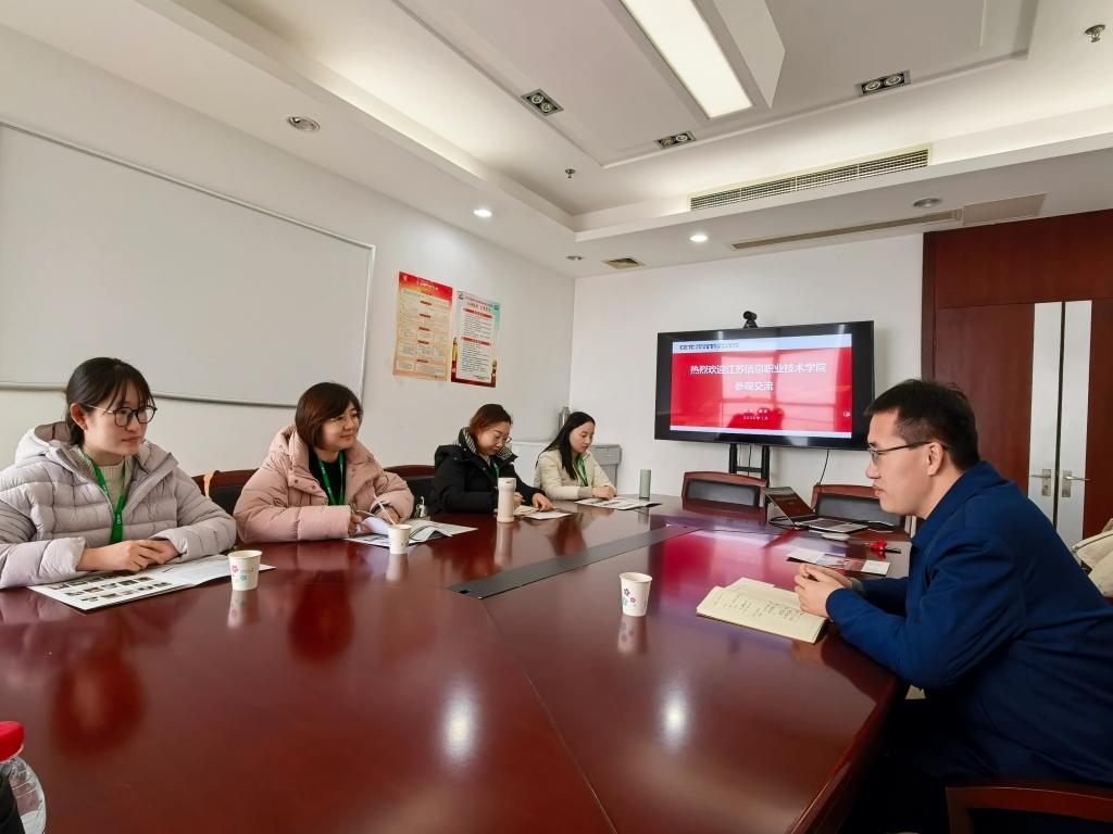 参观结束后,双方举行座谈交流。座谈会上,与会人员共同观看了江苏信息职业技术学院宣传资料,张书记详细介绍了学校的办学理念、学科建设、人才培养体系及办学特色,并重点阐述了物联网工程学院在专业设置、师资力量、实训基地建设等方面的优势,以及近年来在应用型人才培养中取得的成效。谢俊领主任对学校的办学定位与人才培养质量给予高度认可,并结合行业发展趋势,介绍了五十五所的人才需求导向、招聘标准及未来用工规划。
