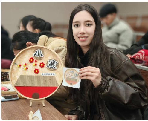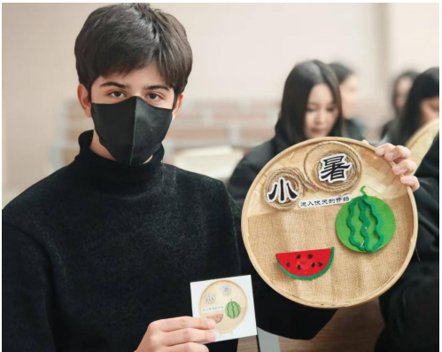 活动中,主讲教师邢虹雨以节气为线索,为国际学生们梳理了从立春到大寒的节气轮回,详细讲解了节气背后的气候规律与农事智慧,更从“天人合一”的哲学高度,阐释了中华民族“尊重自然、顺应天时、和谐共生”的生态观与生命观。同学们沉浸其中,听得津津有味。实践环节,国际学生们以手工黏贴画的形式共同创作二十四节气长卷。嫩绿柳条诠释“清明”,金黄麦穗象征“芒种”,火红枫叶点染“立秋”,纯白棉絮摹写“大雪”……在指尖拼贴的过程中,同学们不仅感受到四时物候的诗意变迁,更体会到中华民族在春耕夏耘、秋收冬藏中凝结的“勤劳奋斗”的民族精神。
