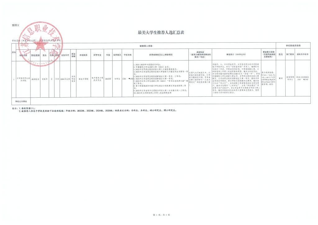 根据《教育部办公厅关于开展“最美高校辅导员”“最美大学生”推选展示活动的通知》(教思政厅函 〔2026〕2 号)、《省教育厅办公室关于转发教育部办公厅开展“最美高校辅导员”“最美大学生”推选展示活动的通知》要求,经个人申报、二级学院审核推荐、学工处组织评审遴选、学校审定,拟推荐微电子学院电子信息工程技术专业2023级宋晓彤同学作为我校2026年“最美大学生”推荐人选,现予以公示。