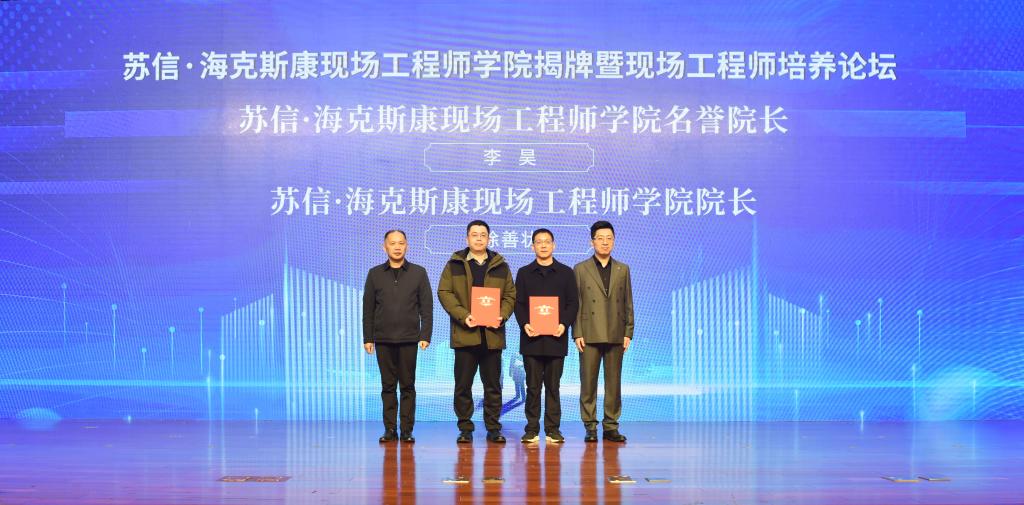 理事长张瑜、孙东辰共同为海克斯康华东事业群无锡方案中心营销总监李昊,江苏信息职业技术学院智能工程学院院长徐善状颁发名誉院长和院长聘书。