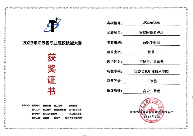 备赛期间,徐东升每日坚持数小时高强度训练:反复校正接线、调试设备、优化通信协议和代码。最终,他与团队一举夺得江苏省职业院校技能大赛物联网赛项一等奖。