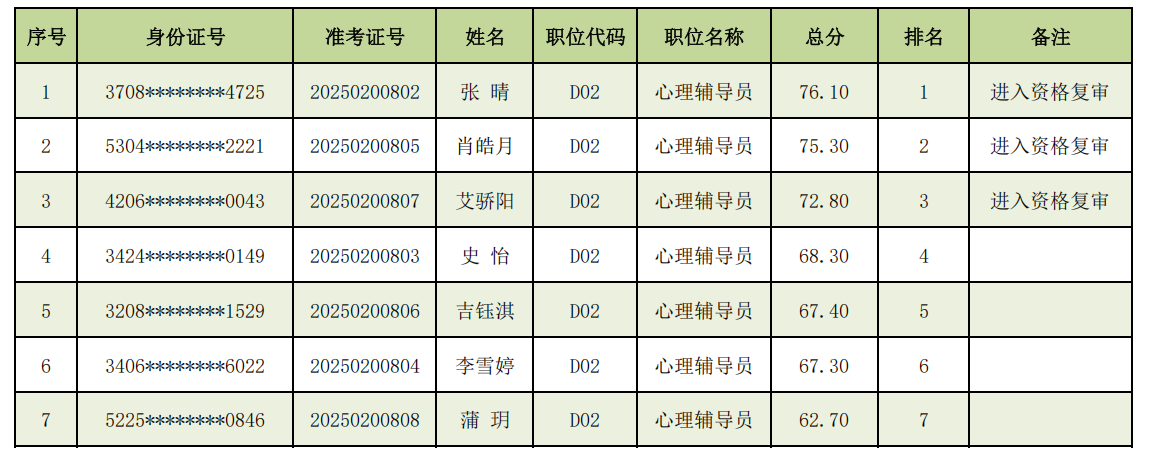 D02专职辅导员岗在笔试成绩合格者中,从高分到低分,按各招聘岗位拟聘用人数1:3,对应聘人员进行资格复审(进入资格复审名单见附件1)。