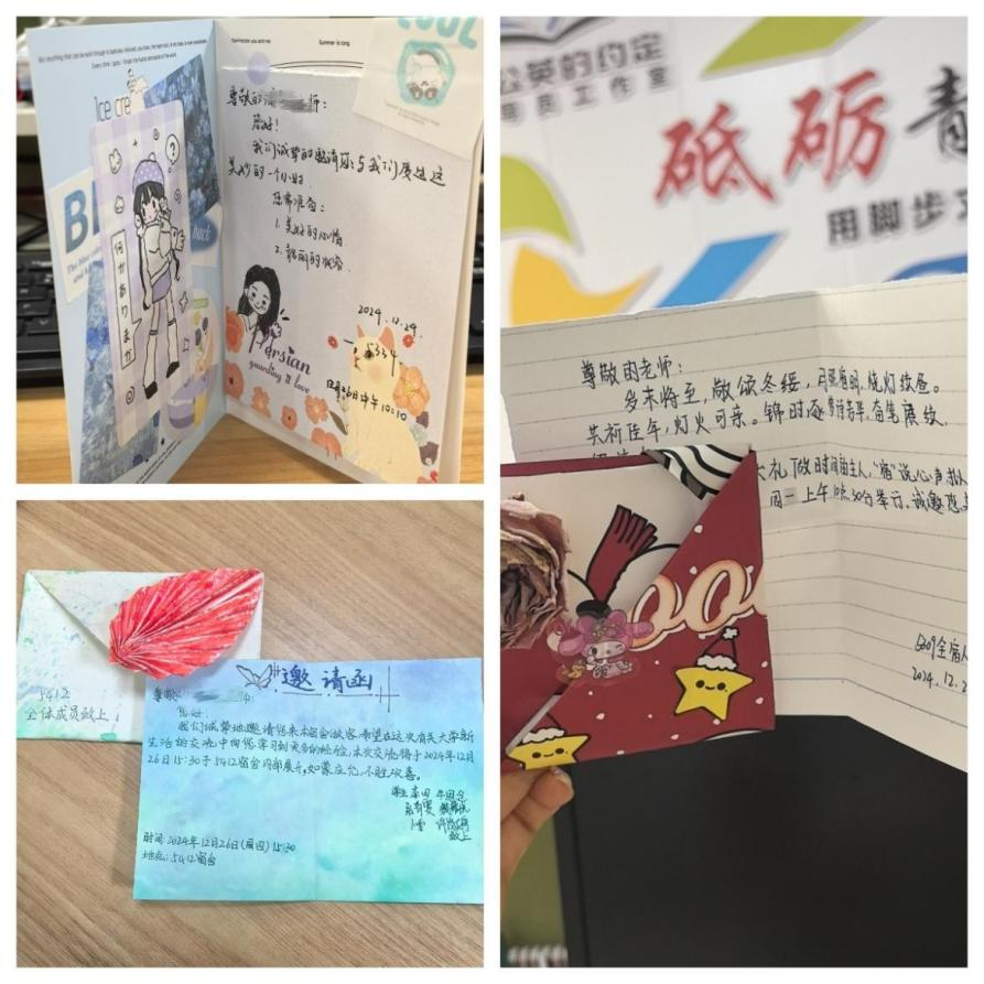 该项活动的起点,是一系列充满创意与诚意的邀请函。与传统的辅导员走访不同,“宿说心声”活动彻底改变了师生间的互动模式——将“教师前来”转变为“学生邀请”。从设计、制作至送达,请柬所承载的不仅是活动信息,更是学生主体意识的提升及对平等对话的真挚期待。当辅导员接过各宿舍精心准备的请柬时,一场以学生为“主角”、以宿舍为“课堂”的深度交流便正式展开。