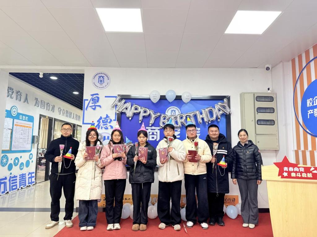 党总支书记张炎向会计245班熊萍、会计241班张婉晴、金融服务与管理252班何宪禹等5名近期生日的学生代表致以诚挚的生日祝福,并赠送生日礼物。她勉励在场同学坚定“青春向党”的信念,将个人理想融入国家发展大局,珍惜韶华、锤炼能力,以奋斗书写无愧于时代的青春篇章。