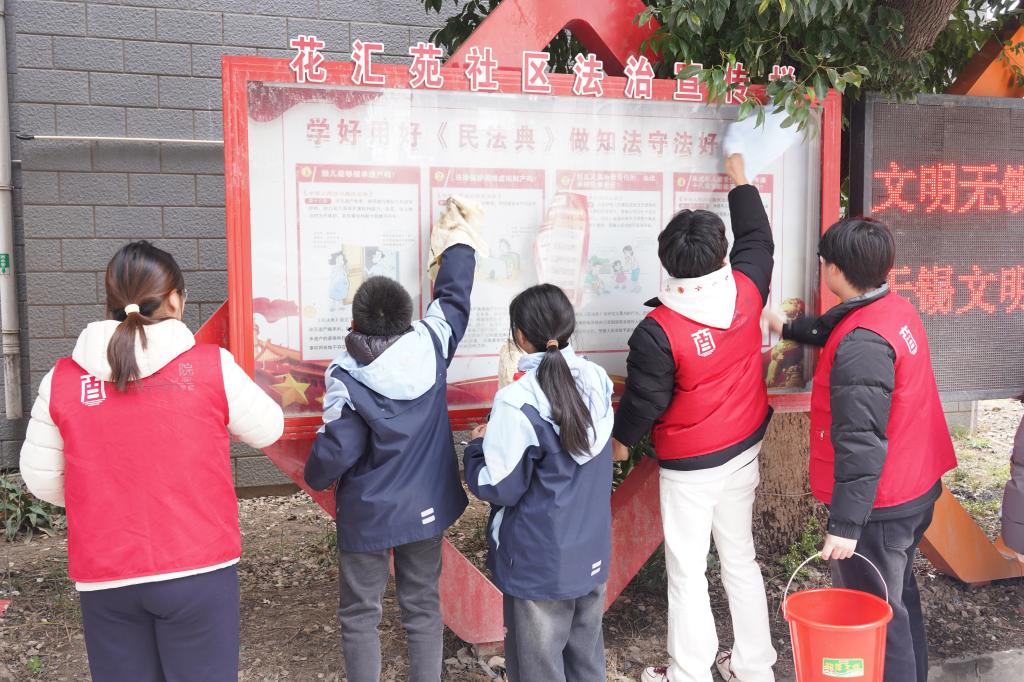 活动在花汇苑社区“幸福家园·乐邻驿站”举行启动仪式后正式展开。学生志愿者与胡埭小学少先队员一一结对,分组开展服务。环境美化组手持夹子、抹布等工具,清理烟头纸屑,擦拭健身器材与宣传栏,以实际行动改善社区环境;广播宣讲组携带扩音设备,在社区流动播报雷锋事迹并倡导尊老敬老,以童声传播红色文化;文艺表演组于广场搭建临时舞台,二胡独奏《赛马》旋律激昂澎湃,合唱《学习雷锋好榜样》洋溢着青春朝气,赢得老年观众阵阵掌声。党员及入党积极分子全程带队,于劳动中体现奉献精神,在互动中践行初心使命。