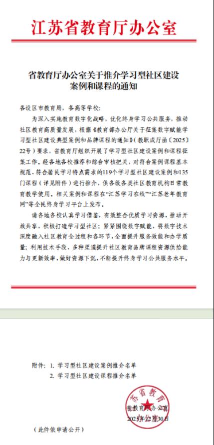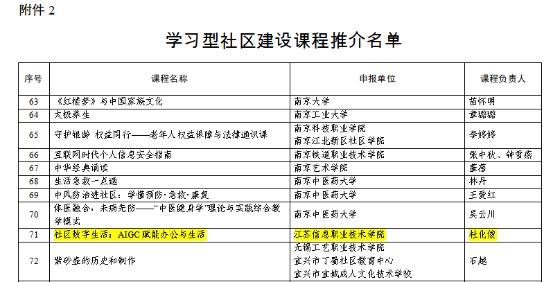 日前,江苏省教育厅办公室发布了《关于推介学习型社区建设案例和课程的通知》。由学院杜化俊老师主持的《社区数字生活:AIGC赋能办公与生活》课程,成功入选省级学习型社区建设课程。