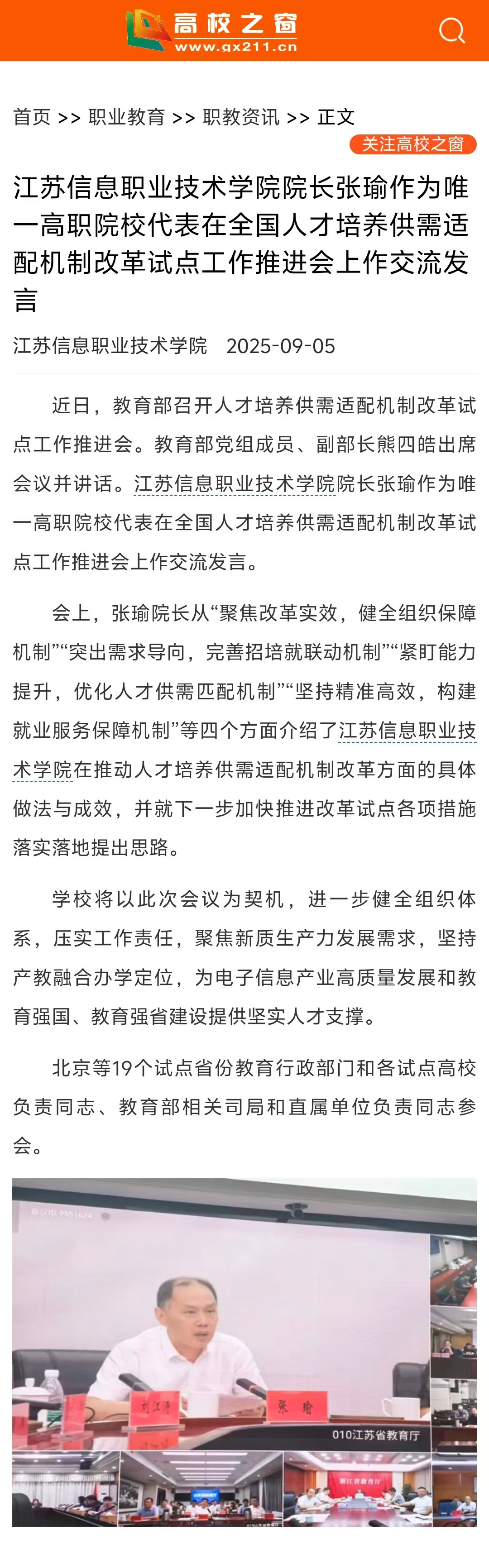 江苏信息职业技术学院院长张瑜作为唯一高职院校代表在全国人才培养供需适配机制改革试点工作推进会上作交流发言