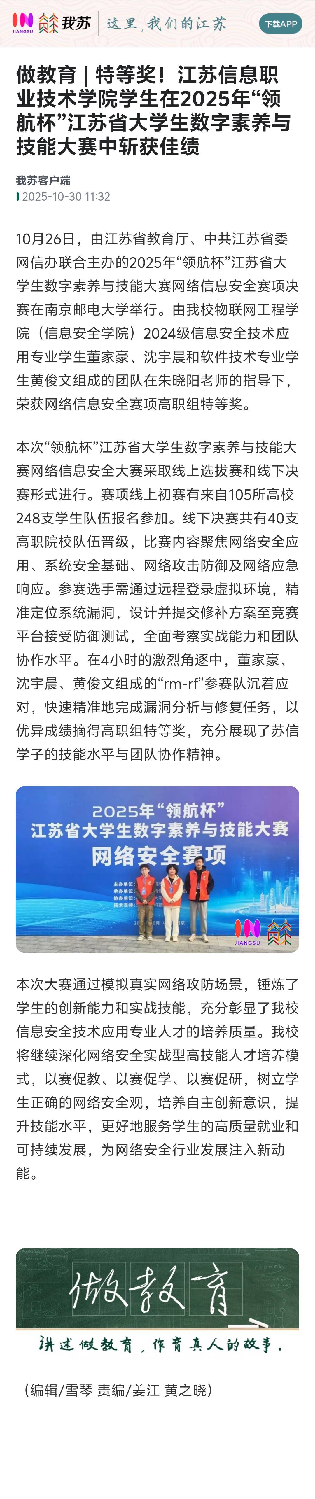 做教育 | 特等奖!江苏信息职业技术学院学生在2025年“领航杯”江苏省大学生数字素养与技能大赛中斩获佳绩