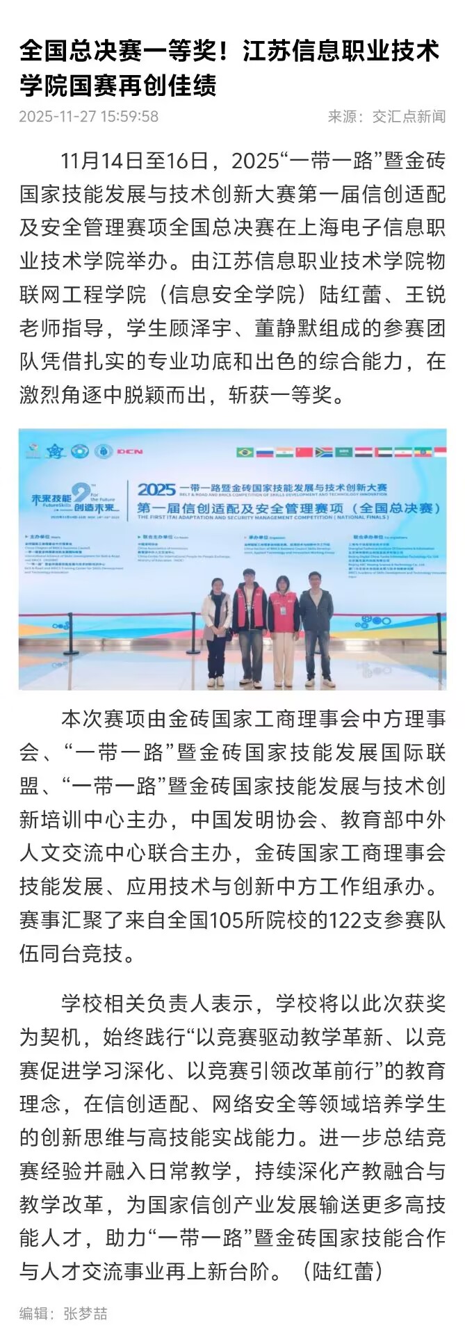 全国总决赛一等奖!江苏信息职业技术学院国赛再创佳绩