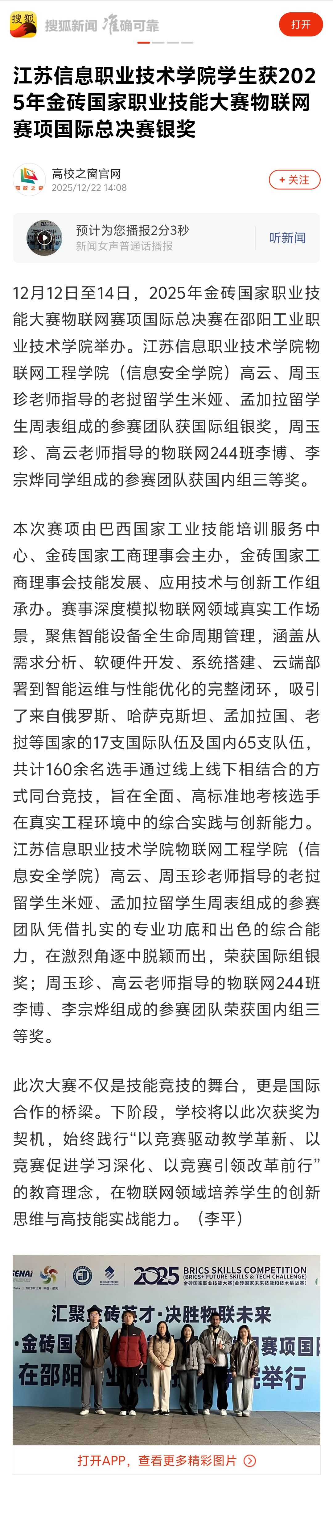 江苏信息职业技术学院学生获2025年金砖国家职业技能大赛物联网赛项国际总决赛银奖