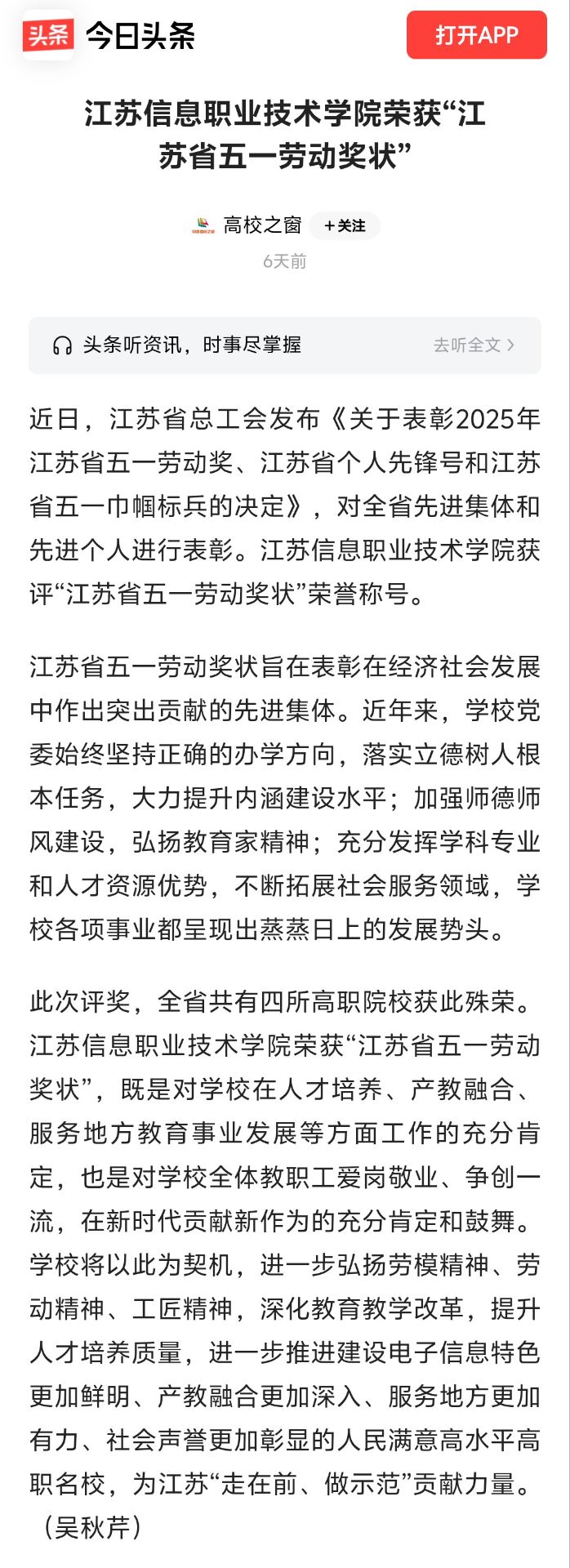 江苏信息职业技术学院荣获“江苏省五一劳动奖状”
