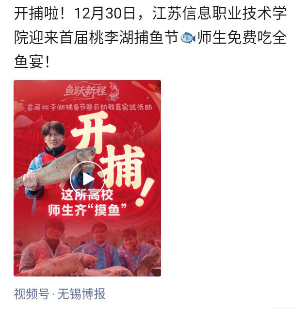 开捕啦!12月30日,江苏信息职业技术学院迎来首届桃李湖捕鱼节🐟师生免费吃全鱼宴!