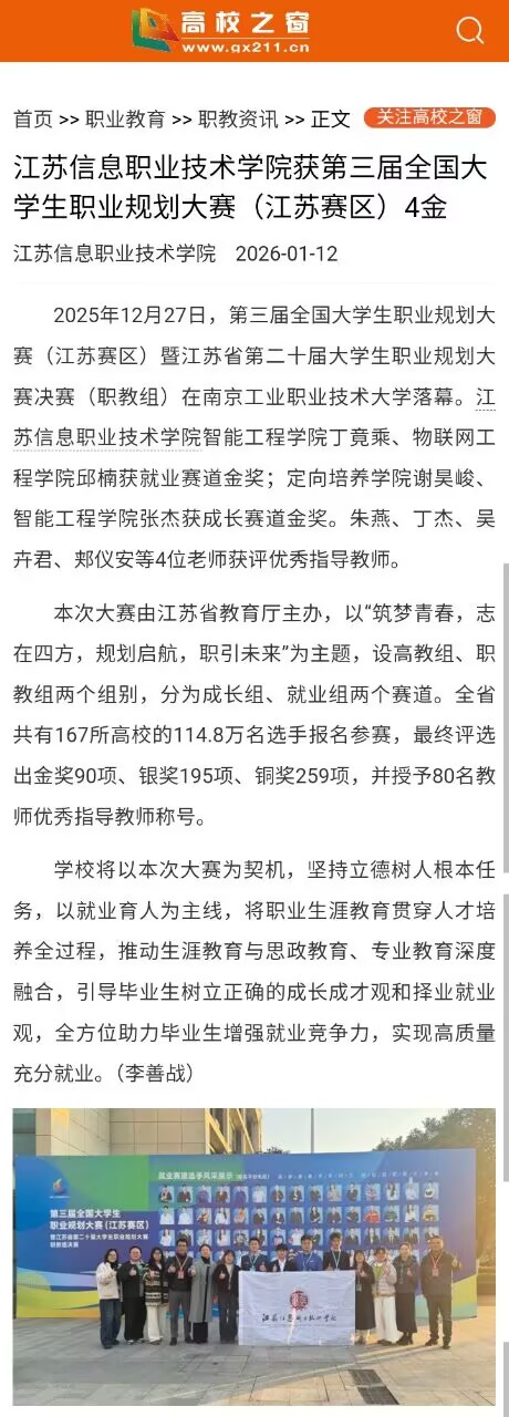 江苏信息职业技术学院获第三届全国大学生职业规划大赛(江苏赛区)4金