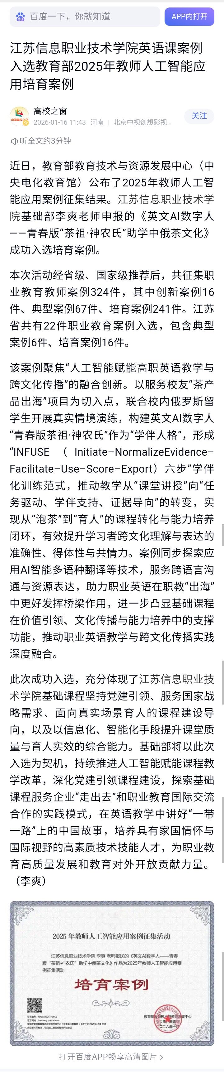江苏信息职业技术学院英语课案例入选教育部2025年教师人工智能应用培育案例