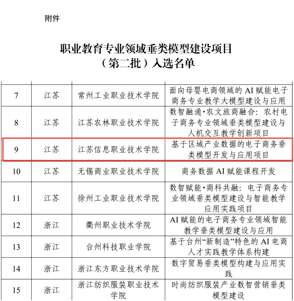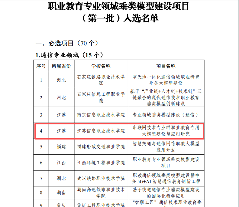 本次在全国范围内共遴选出70个必选项目,87个基础项目。其中必选项目江苏高职院校入围11个,我校汽车与智能交通学院申报的“车联网技术专业群职业教育专用大模型建设与应用研究”入选;基础项目江苏高职院校入选9个,我校商学院申报的“基于区域产业数据的电子商务垂类模型开发与应用项目”入选。两个项目将分别与中兴通讯股份有限公司、北京火山引擎科技有限公司进行深度合作,共同完成项目建设任务。